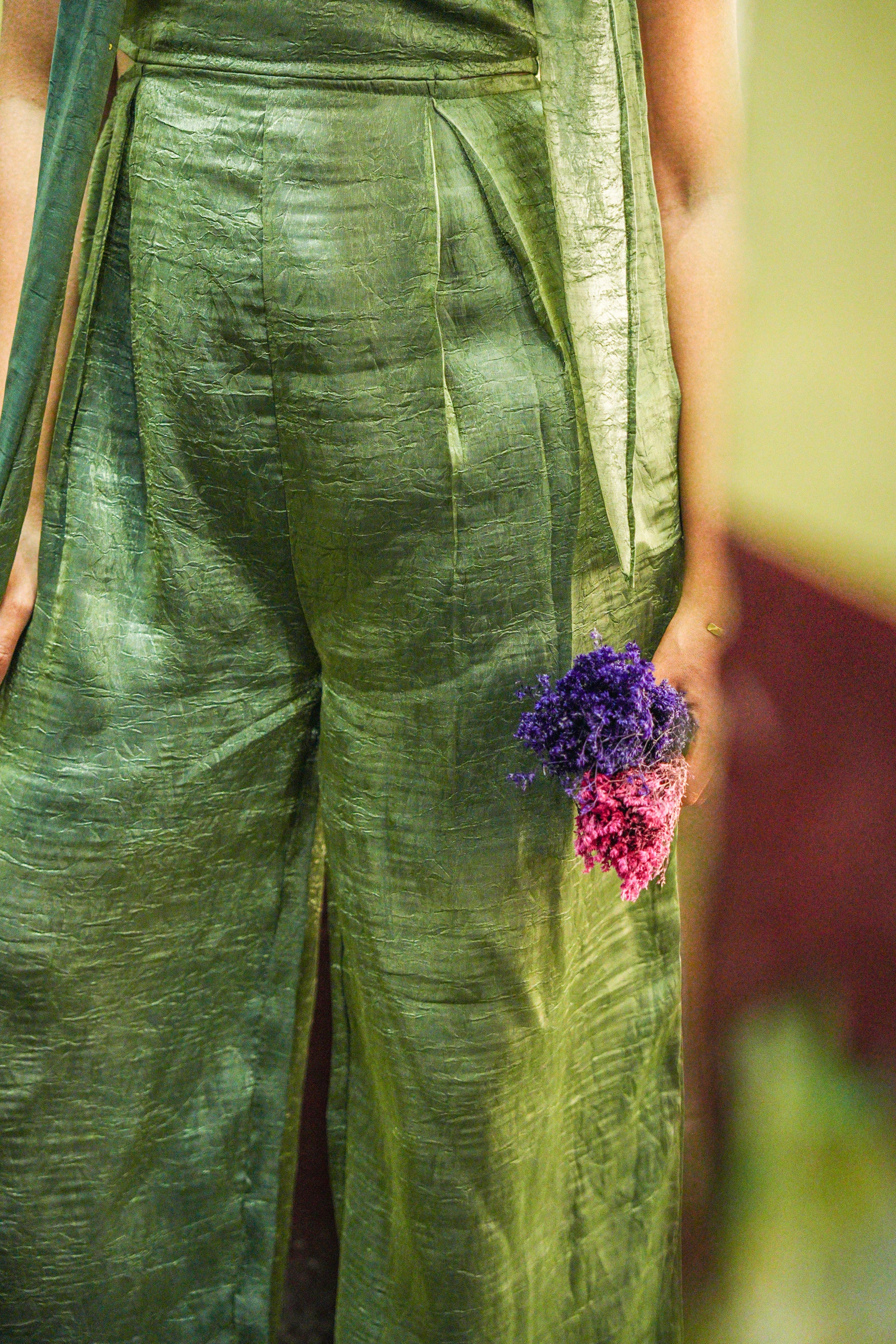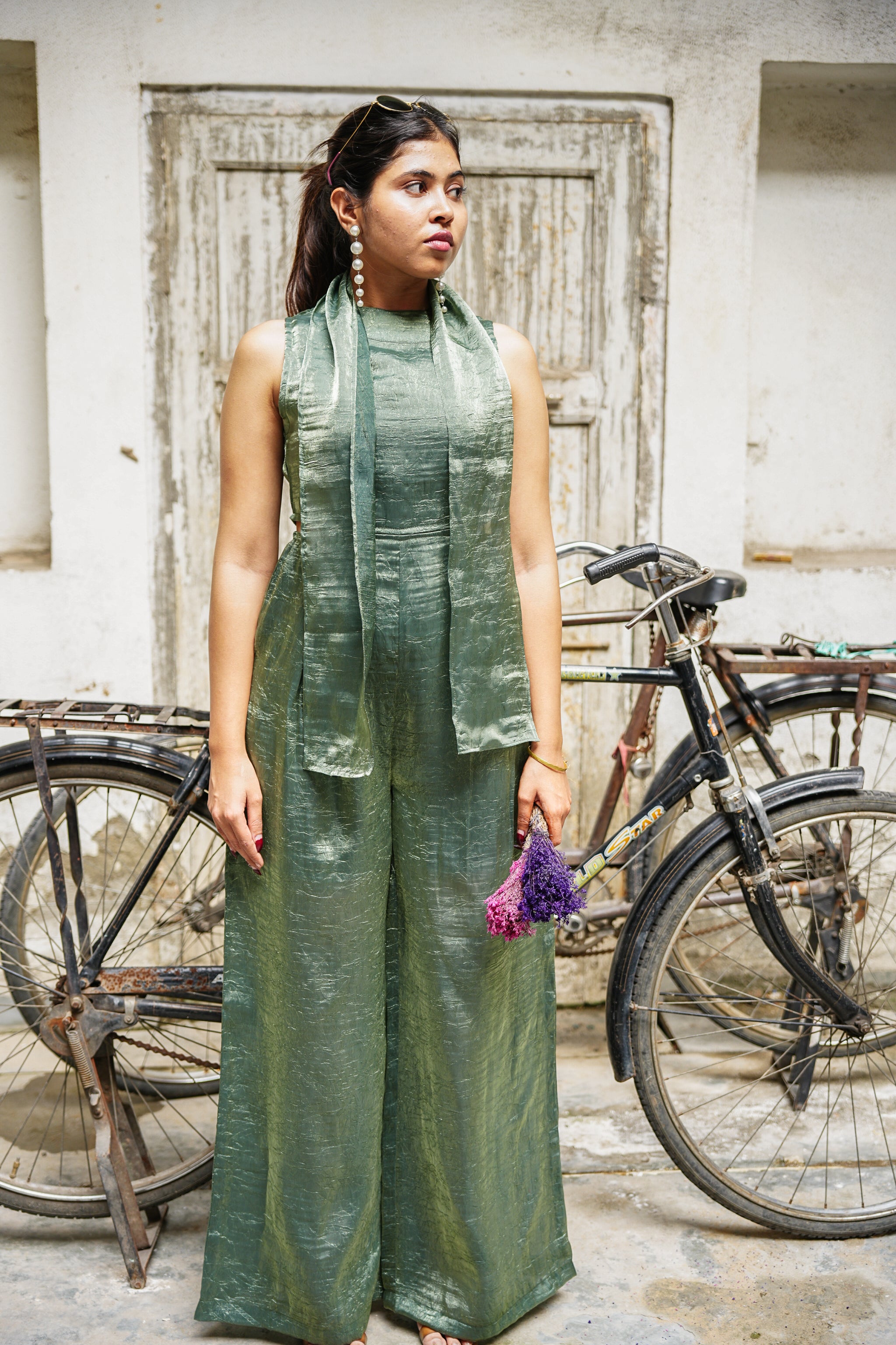 - Make a statement this festive season in a stunning green Viscose Chinon jumpsuit, perfect for Diwali celebrations and wedding soirées.